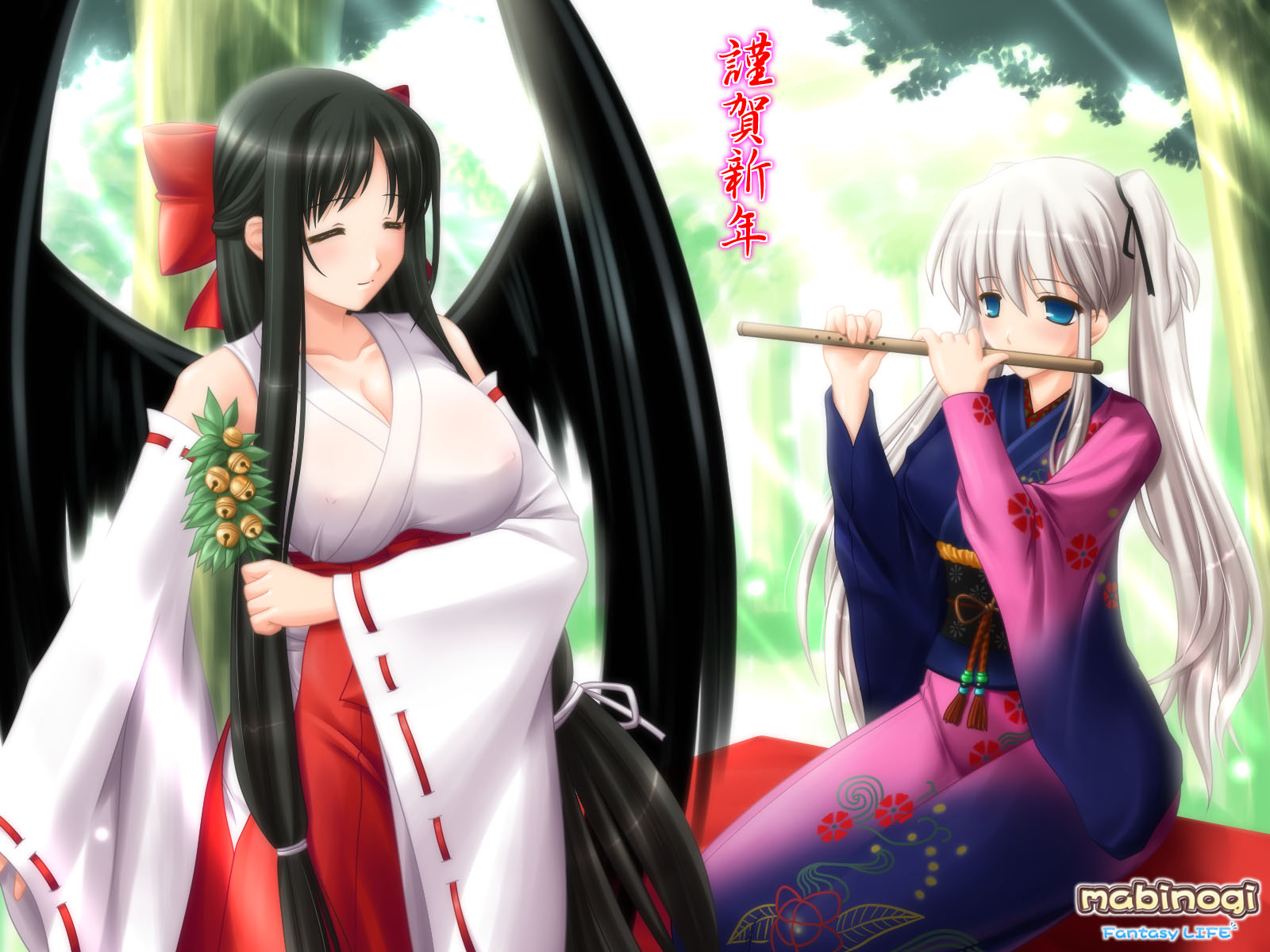 2girlsangel wingsbare shouldersblack hairblack wingsblue eyesblushbreastsclosed eyesflutehalf updohuge breastsinstrumentjapanese clotheskimonolong hairmikomultiple girlssee-through clothestwintailsvery long hairwhite hairwings