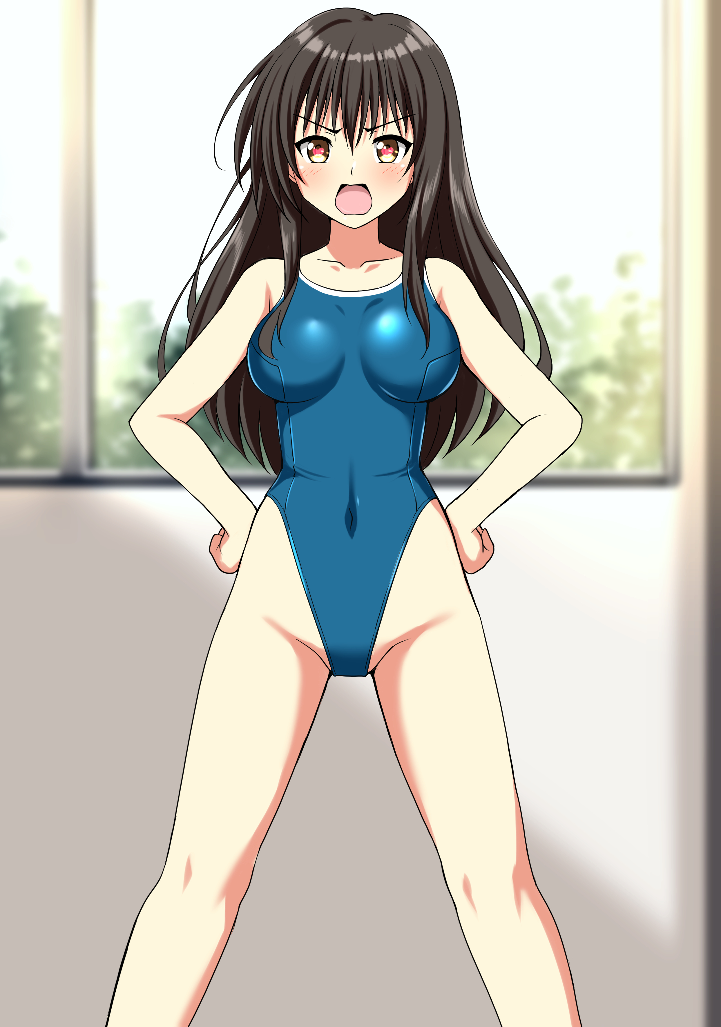 1girlblack hairblurryblurry backgroundblushbreastsbrown eyescovered naveldepth of fieldfrowngreen one-piece swimsuithands on own hipshighleghighleg one-piece swimsuitindoorslarge breastslooking at viewerone-piece swimsuitopen mouthschool swimsuitsolostandingswimsuit