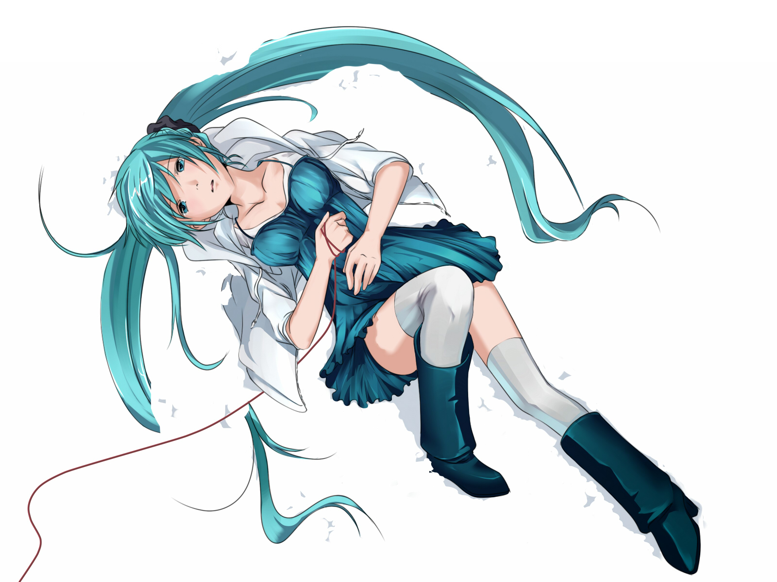 1girlaqua eyesaqua hairbootsbreastscollarbonefemale focusfull bodylong hairlyingon backsnowsolostringstring of fatethighhighstwintailsvery long hairwhite background