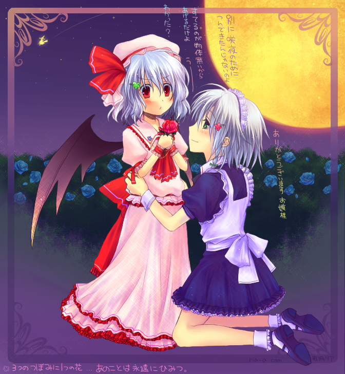 2girlsbat wingsbraidfemale focusflowergreen eyeshatkneelingmoonmultiple girlsred eyesroseshort hairtsunderewings