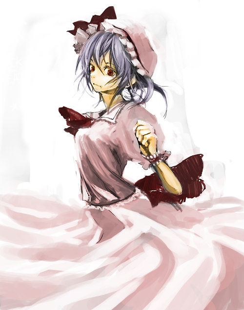 1girldressfangfang outfemale focushatlooking at viewermob cappink dresspink hatpuffy short sleevespuffy sleevesred eyesshort sleevessimple backgroundsolowhite backgroundwrist cuffs