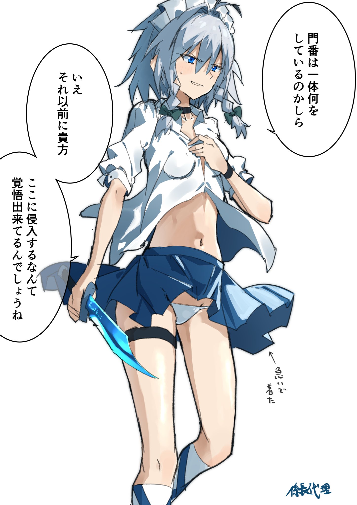 1girlblue eyesblue skirtbraidbreastsgrey hairmaid headdresspantiesshirtskirtsmall breastsspeech bubbleswordtwin braidsunderwearweaponwhite backgroundwhite shirt