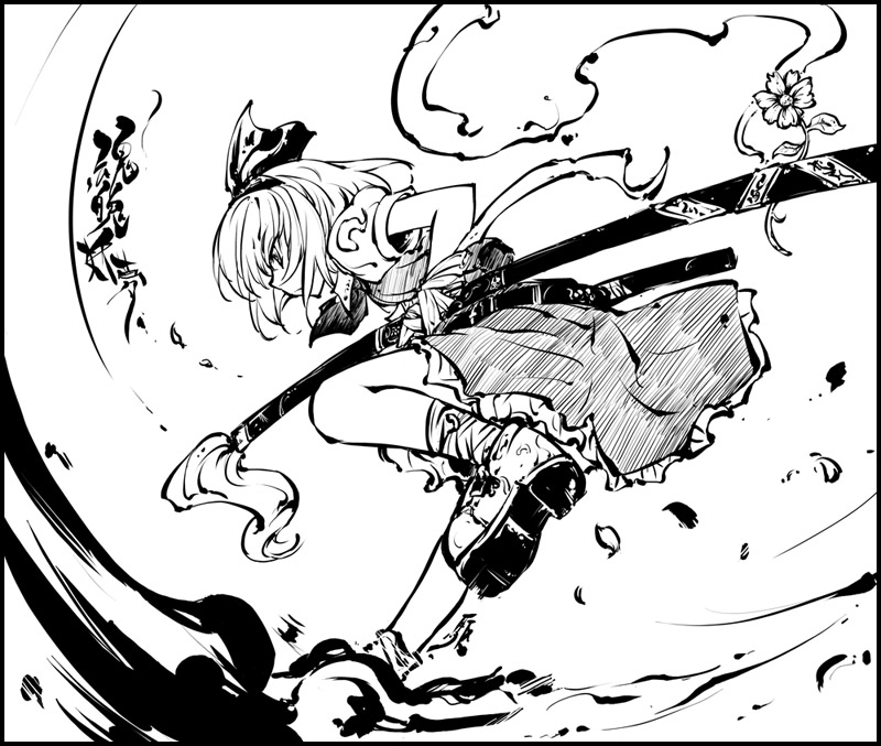 1girlfemale focusghostgreyscalehairbandhitodamakatanamonochromesheathsheathedshort hairsoloswordweapon