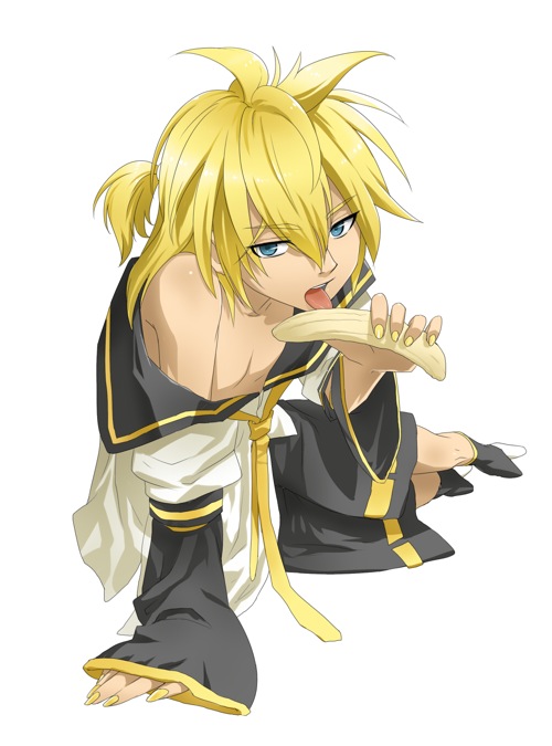1boyaqua eyesarm supportbananabare shouldersblonde hairfoodfruitholdingholding foodholding fruitleaningmale focusnail polishsoloyellow nails