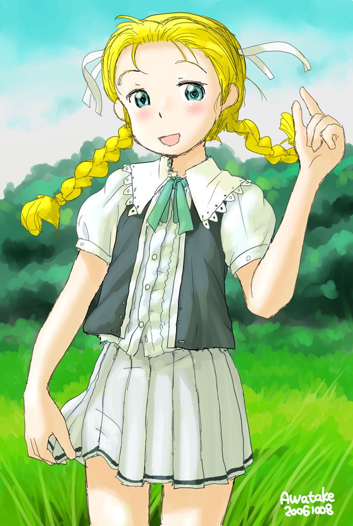 00s1girl2006aqua eyesartist nameblonde hairblushbraiddatedgrassgreen eyeslong hairlooking at viewerminiskirtoutdoorspleated skirtskirtskirt setsmiletwin braids