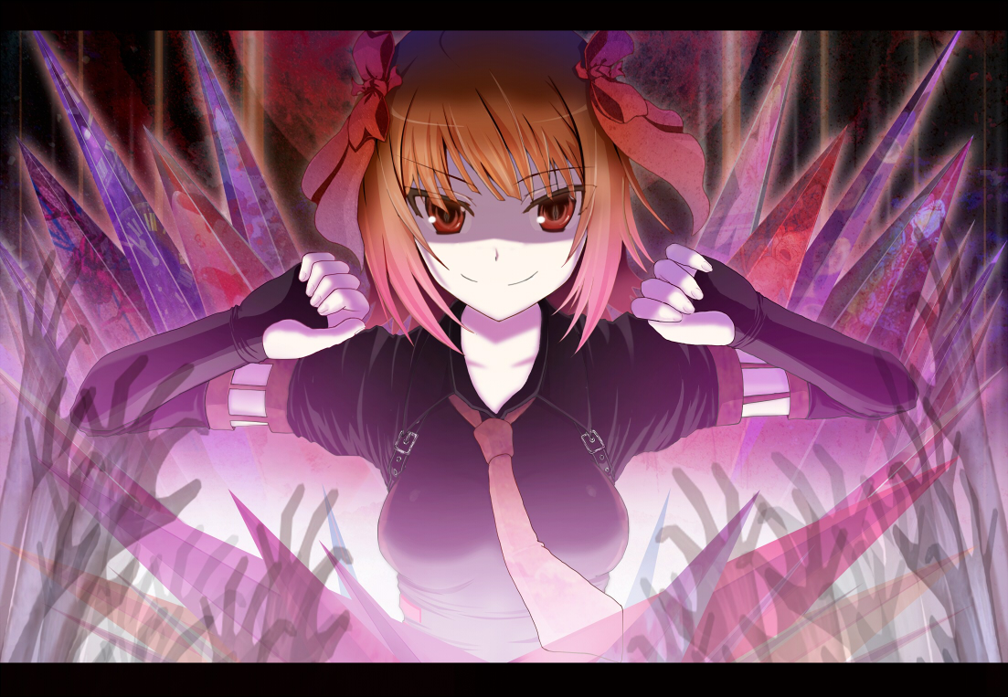 00s1girlbrown eyesbrown hairfemale focusfingerless glovesgloveshair ribbonletterboxedlooking at viewernecktiepunkish gothicred eyesribbonshort hairsmilesmirksolotsurimeupper body