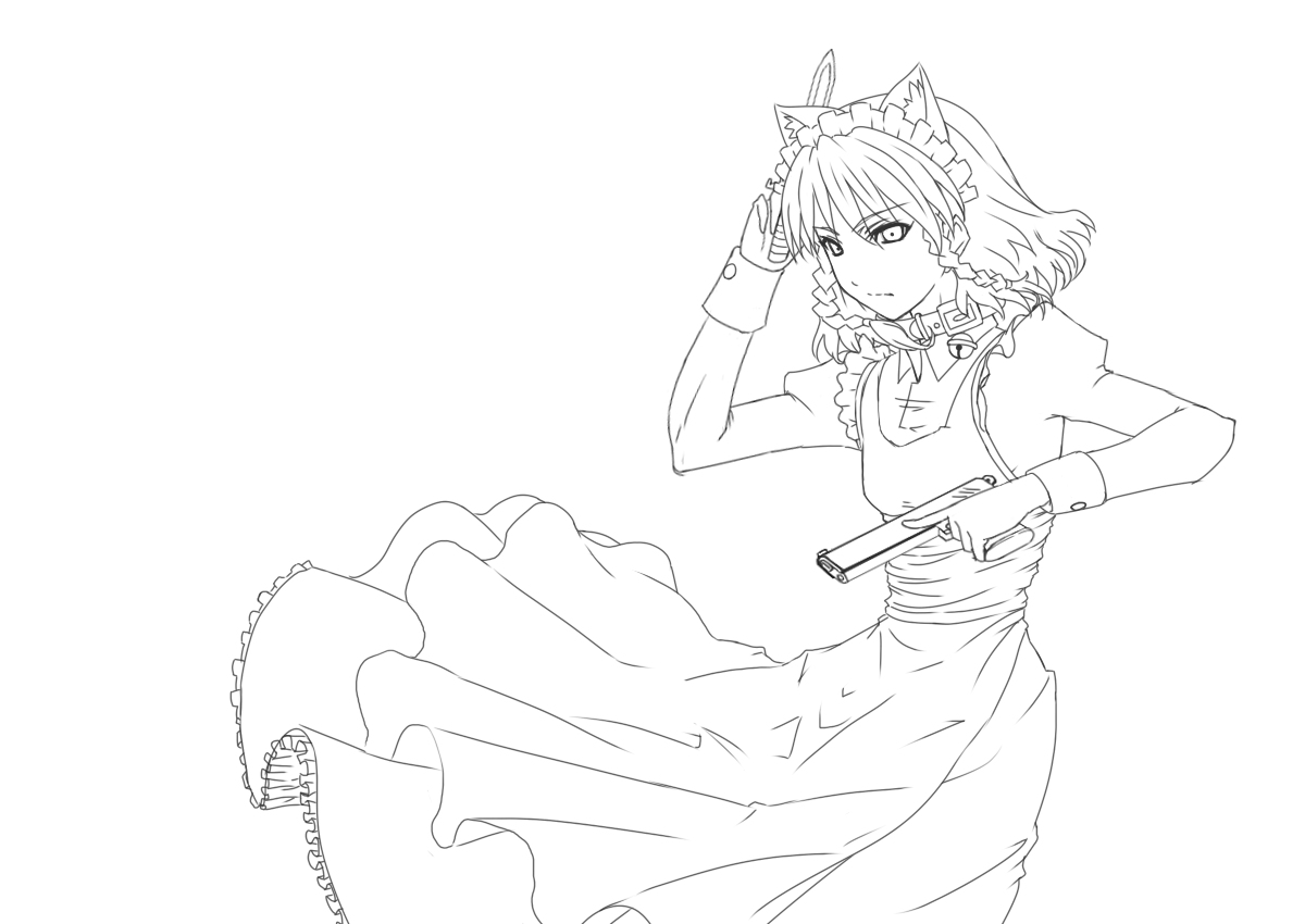 1girlanimal earsbellbraidcat earscat girlcollarfemale focusgreyscalegunhandgunknifemaidmonochromeneck bellparodypistolsimple backgroundsolotwin braidsweaponwhite background