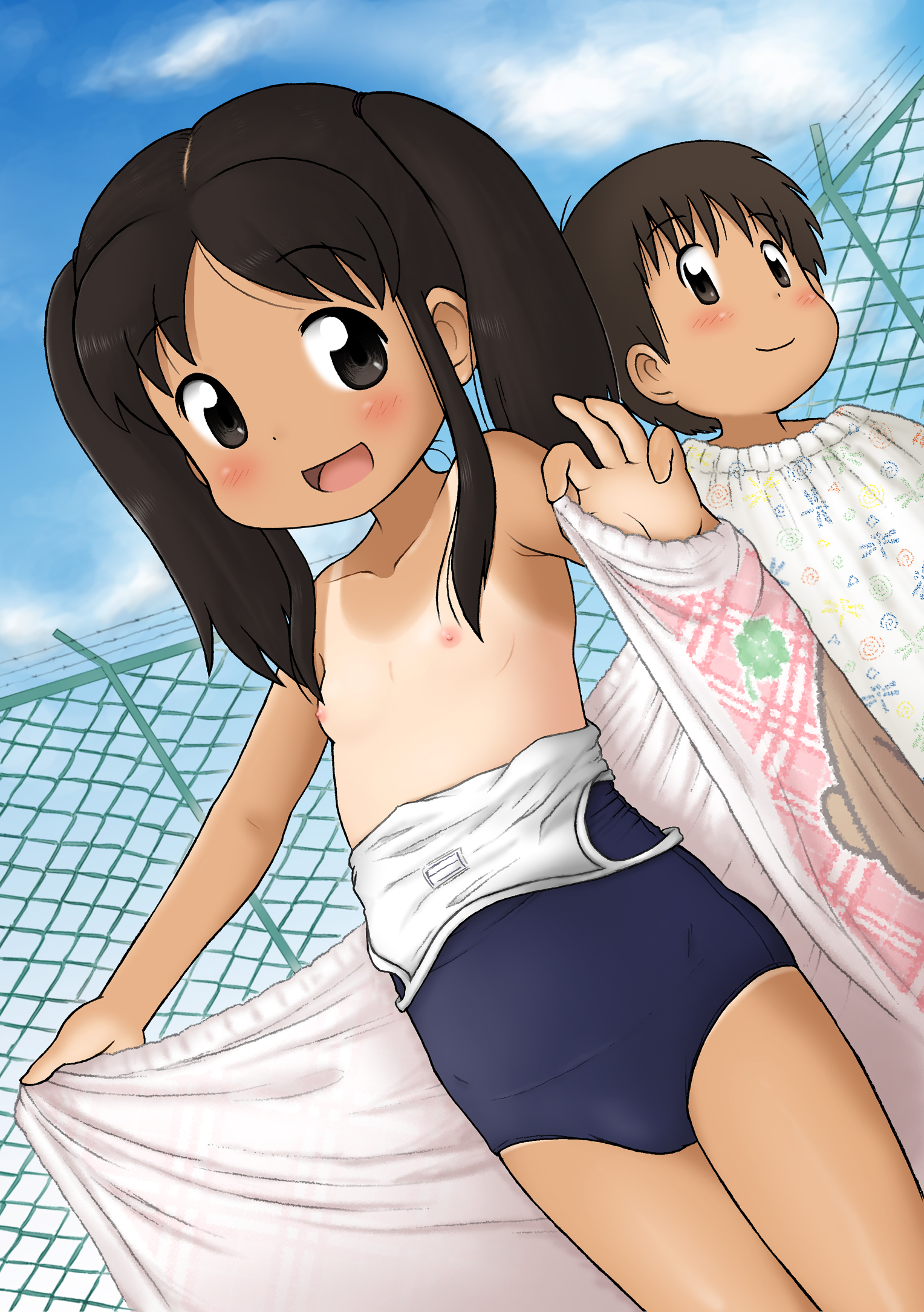najimi shin, mamoru (sister princess), sister princess, 00s, 1girl, blush, brown eyes, brown hair, chair, dated, english text, female focus, full body, long sleeves, looking at viewer, on chair, shirt, shoes, short hair, shorts, sitting, sitting backwards, sneakers, solo, spread legs, straddling, t-shirt, upright straddle