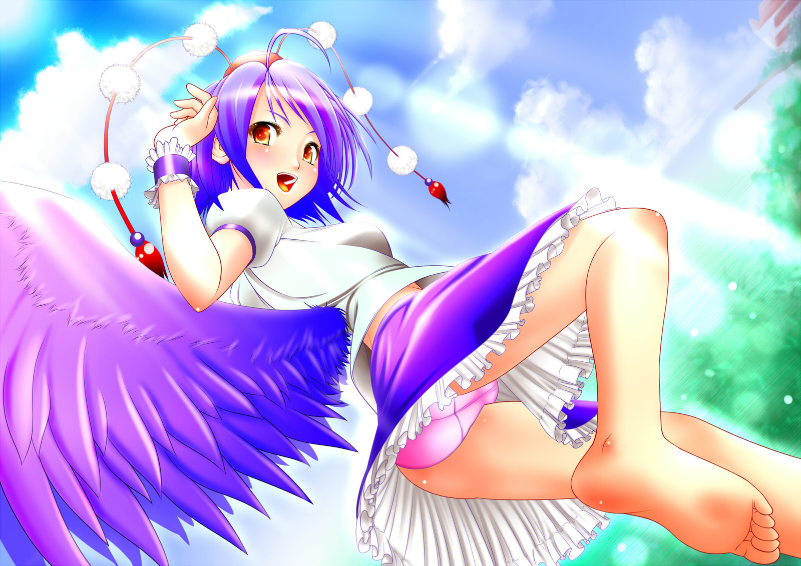 1girlbarefootblack hairblack wingsblushfeetfemale focushatlooking at vieweropen mouthpantiesred eyesshort hairsmilesolotokin hatunderwearwings