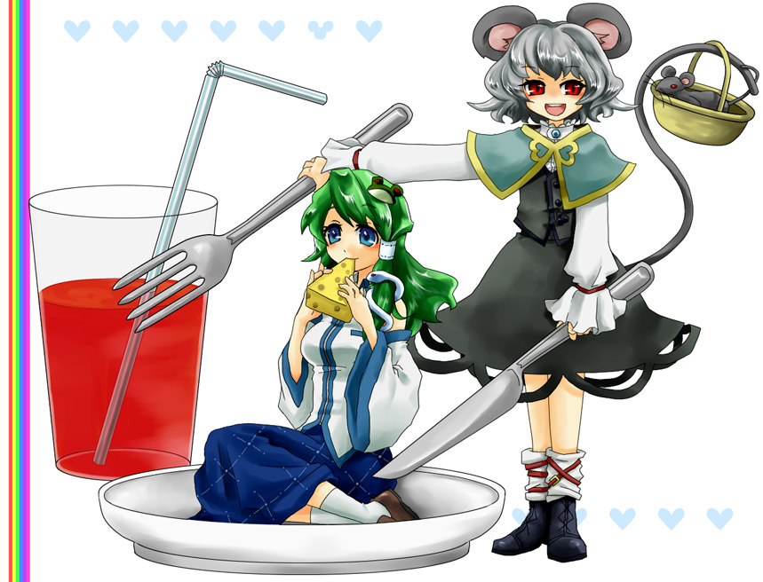 2girlsanimal earsbad foodbasketblue eyescapeletcheesedetached sleevesdrinkdrinking straweatingfemale focusfoodforkfroggreen hairgrey hairholdingholding forkknifelong hairmini personminigirlmouse (animal)mouse earsmouse tailmultiple girlson plateoversized objectplatered eyesshort hairsnaketail