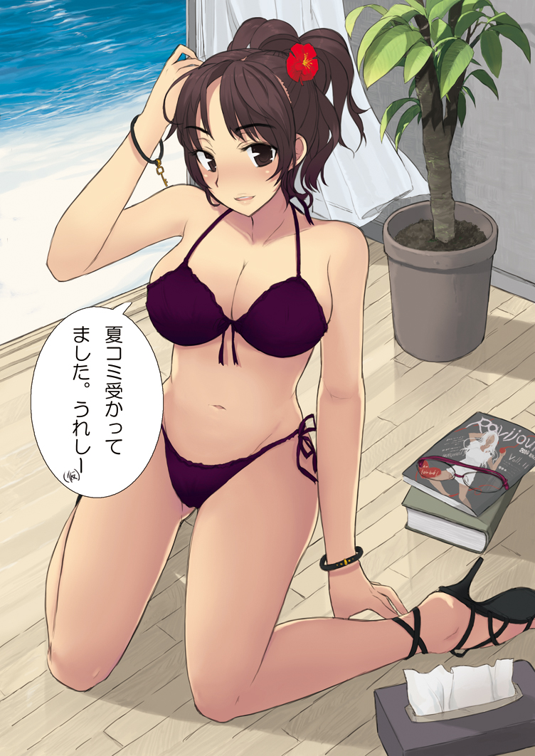 hoshino lala, hibiki ryouga, ranma-chan, saotome ranma, ranma 1/2, translation request, 1boy, 1girl, braid, breasts, closed eyes, fang, genderswap, genderswap (mtf), happy, hetero, hug, medium breasts, nipples, red hair, scene reference, shorts, sideboob, single braid, smile, surprised, topless female