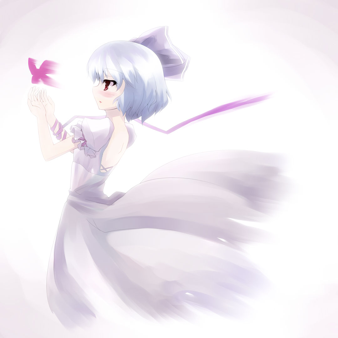 1girlbackless dressbackless outfitblushbowbugbutterflydressfemale focushair bowred eyesshort hairsolo