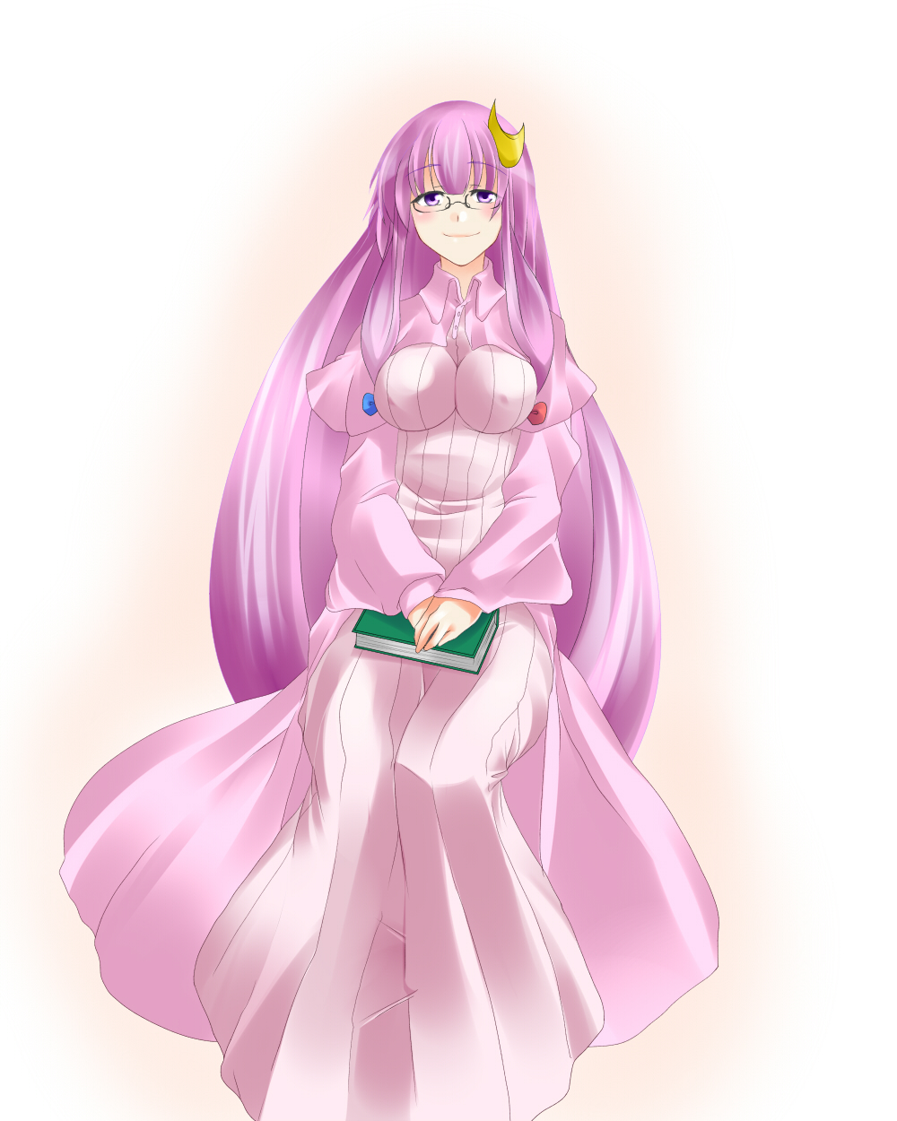 1girlaged upbespectacledbookbreastscrescentcrescent hair ornamentdressfemale focusglasseshair ornamentimpossible clothesimpossible shirtlarge breastslong hairpurple eyespurple hairribbonshirtsittingsolovery long hair
