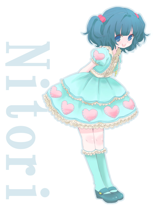 1girlalternate costumearms behind backblue eyesblue hairblue sockscharacter namedressfemale focushair bobbleshair ornamentheartkneehighslolita fashionmary janesmatching hair/eyesshoesshort hairsmilesockssolotwintailstwo side up