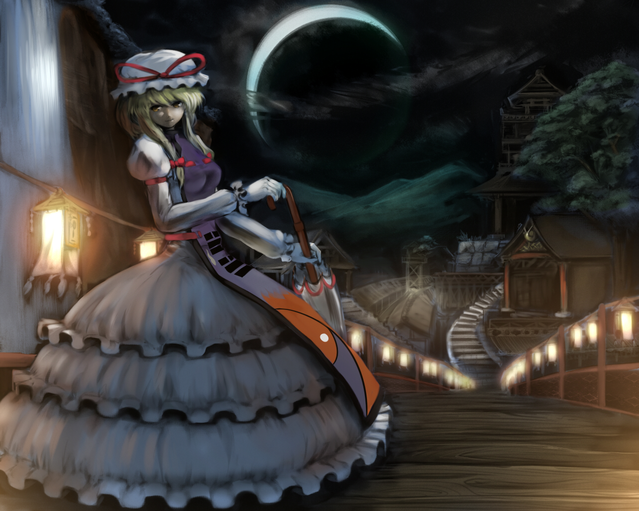 1girlarchitectureblonde hairbowbreastsbridgebuildingcloudcrescent moondresseast asian architecturefemale focusfrilled dressfrillsgloveshair bowhair uphatizakayalanternlong sleeveslooking at viewerlooking to the sidemedium breastsmoonnightnight skysceneryshort hairskysolotabardtreeumbrellavanishing pointwaterwaterfallwhite dresswhite gloveswhite hatyellow eyes