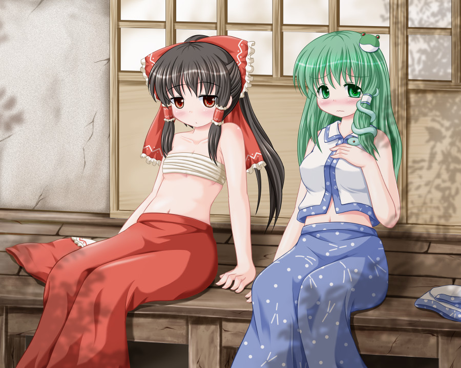 2girlsblushbowbrown eyesbrown hairchest sarashifemale focusfrog hair ornamentgreen eyesgreen hairhair bowhair ornamentlong hairmidriffmultiple girlsnavelponytailsarashisittingskirtsnakesnake hair ornament