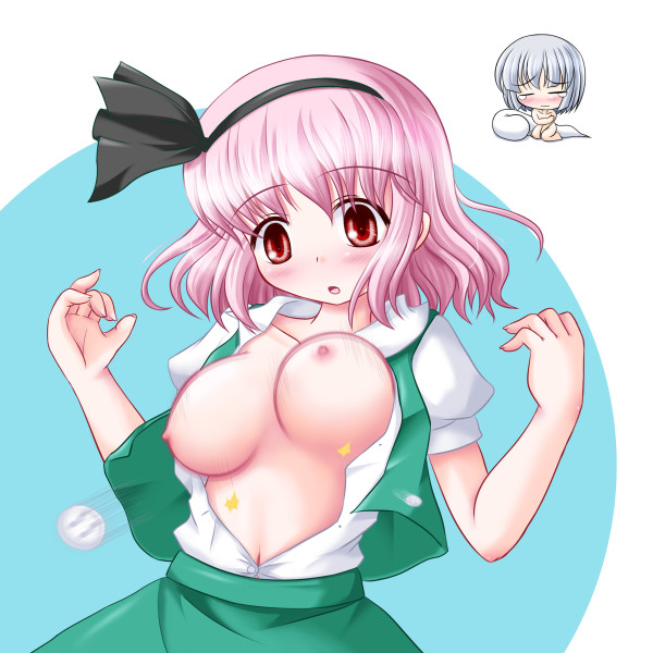 2girlsblushbouncing breastsbreastsbursting breastsbuttonschibicosplayfemale focusghosthairbandhitodamakonpaku youmu (cosplay)large breastsmultiple girlsnavelnipplesnudepink hairpopped buttonred eyesshort hairsurprisedtearswardrobe malfunction