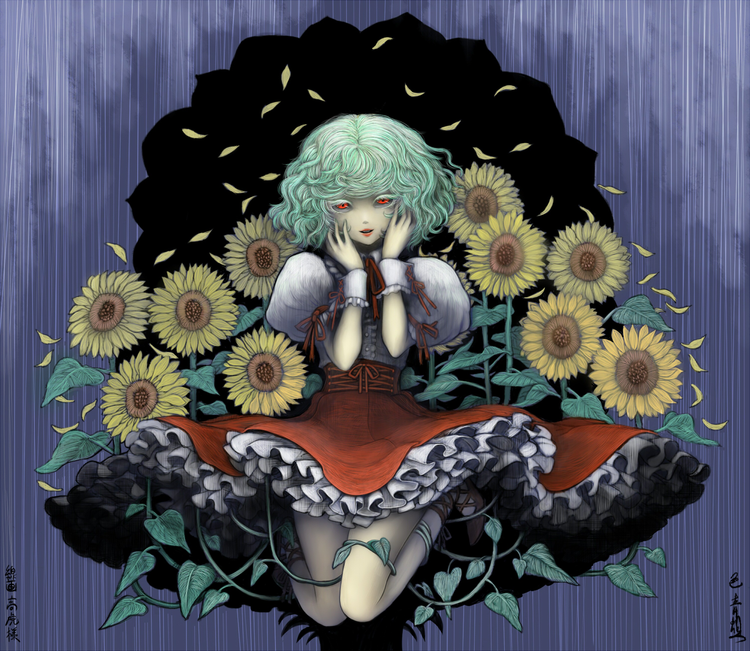 1girlblack scleracolored sclerafemale focusflowergreen hairhands on own facekneelingpetalspetticoatplantpuffy sleevesred eyesshort hairskirtsolosunflowervineswrist cuffs