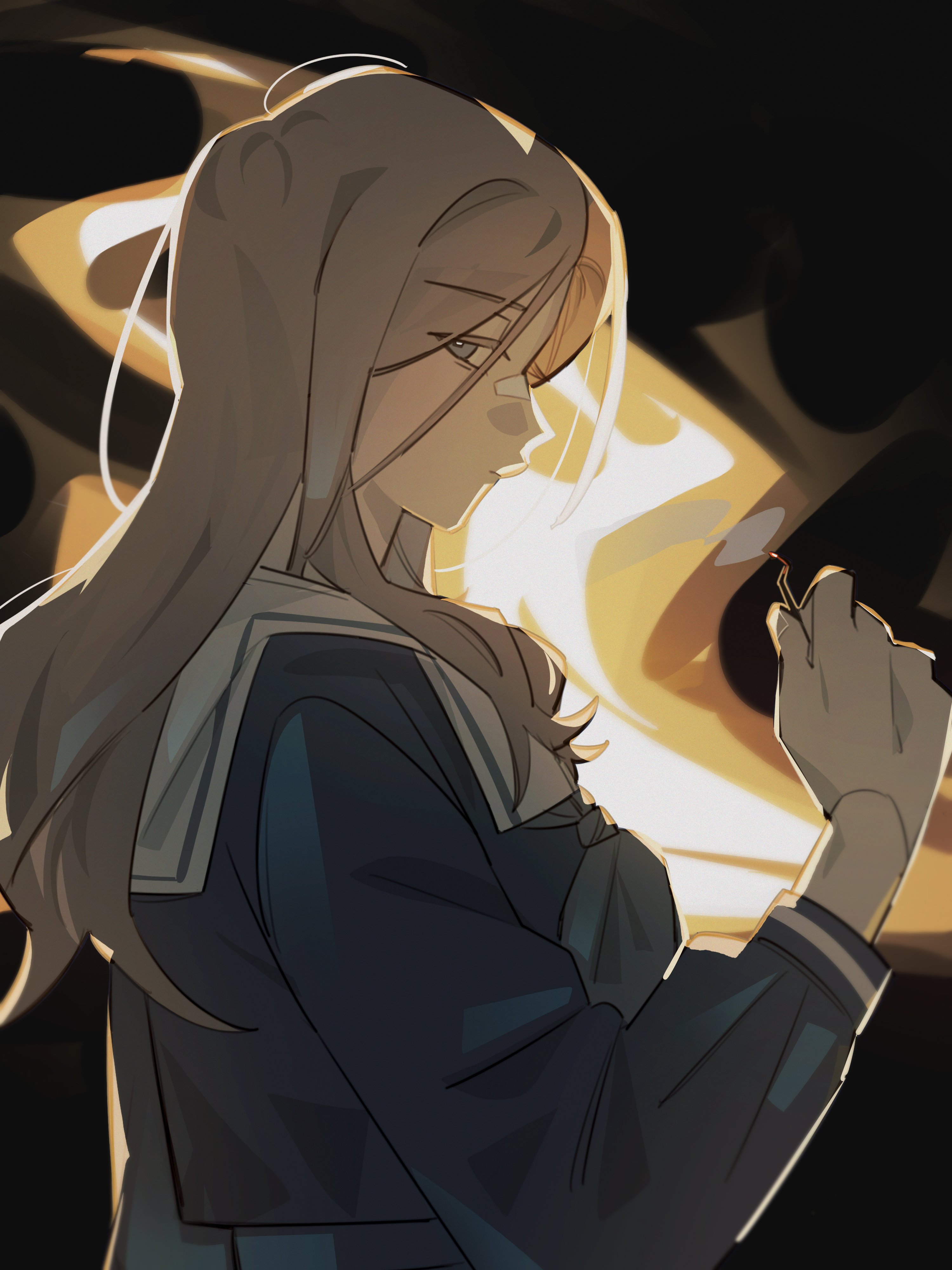 1girlblack backgroundblue shirtbrown hairclosed mouthfirehand upholding matchsticklong hairlooking at viewersailor collarschool uniformshirtsolotsukinomori school uniformupper bodywhite sailor collar
