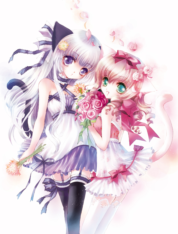2girlsanimal earsbowcat earscat tailchokerdressflowerfrillsgarter beltgreen eyesmultiple girlspetalspink hairpurple eyespurple hairtailthighhighszettai ryouiki