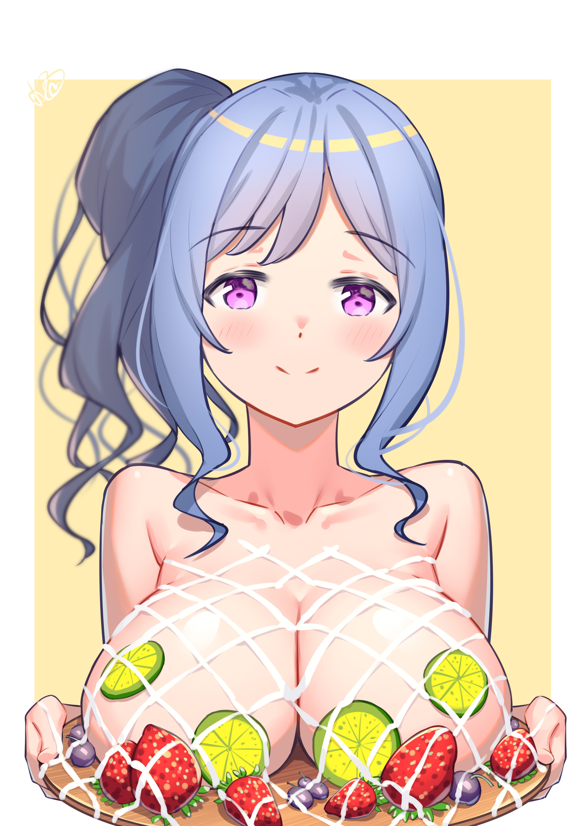 1girlblue hairblueberryblushbreast restbreastsbreasts on traycarried breast restcarryingcleavageclosed mouthcollarboneconvenient censoringcurly hairdot nosefoodfood on bodyfood on breastsfruithands upholdingholding traylarge breastslime (fruit)lime slicelooking at viewerpurple eyesside ponytailsignaturesmilesolostrawberrytopless femaletrayupper bodywavy hairwooden tray