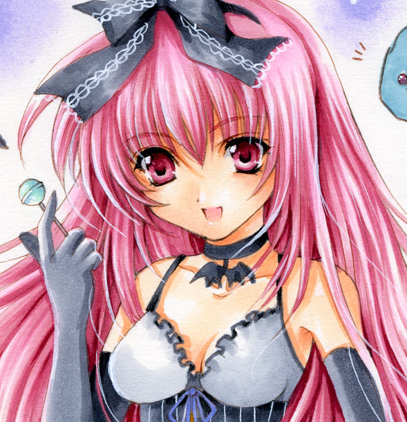 1girlbat (animal)candychokerdresselbow glovesfemale focusfoodglovesgradient backgroundhalloweenlollipoplong hairpink eyespink hairportraitsoloupper body