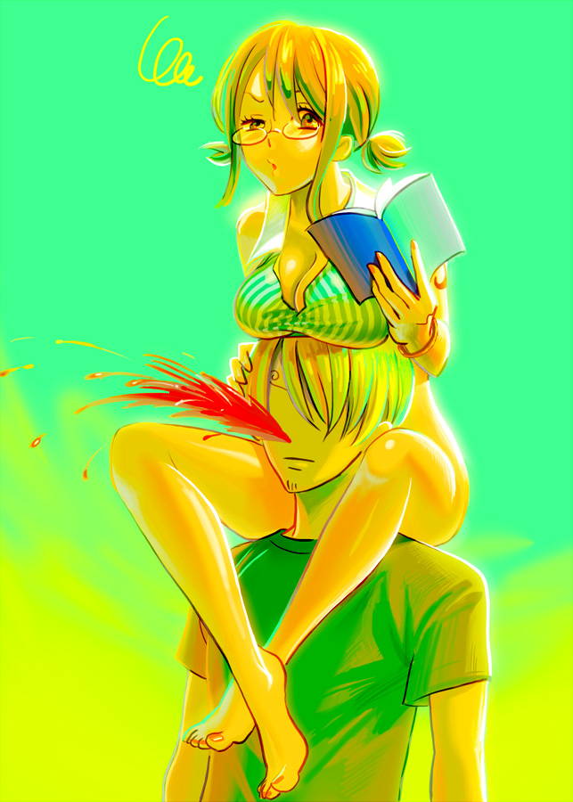 1boy1girlartistic errorbanglebarefootbloodbookbottomlessbraceletbreast restbreastsbreasts on headcarryingcleavagecouplefacial hairfeetglassesjewelryno pantiesnosebleedorange hairpiggybackshoulder carrytattootwintails