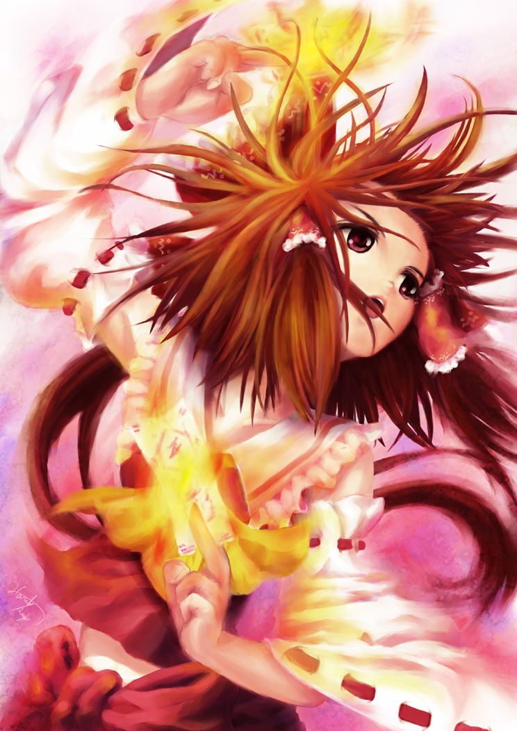 1girlbowbrown hairdetached sleevesfemale focusfirehair bowjapanese clotheslong hairmikored eyessolo