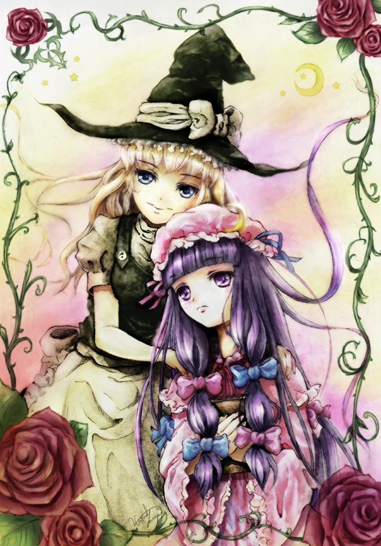 2girlsblonde hairblue eyesbookbowfemale focusflowerhatlong hairmultiple girlspink bowpurple eyespurple hairroseshort hairwineswitchwitch hat