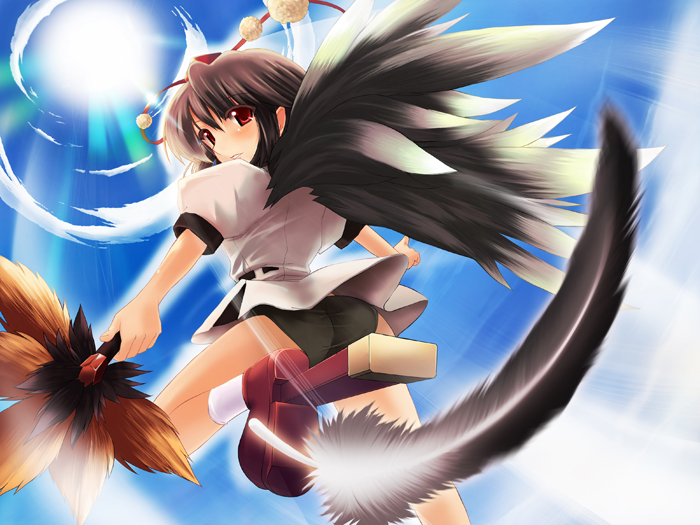 1girlassblack wingsbrown hairdayfeathersfemale focusgetahand fanhatlooking at viewerpantiesred eyesshort hairskysolotengu-getatokin hatunderwearwings