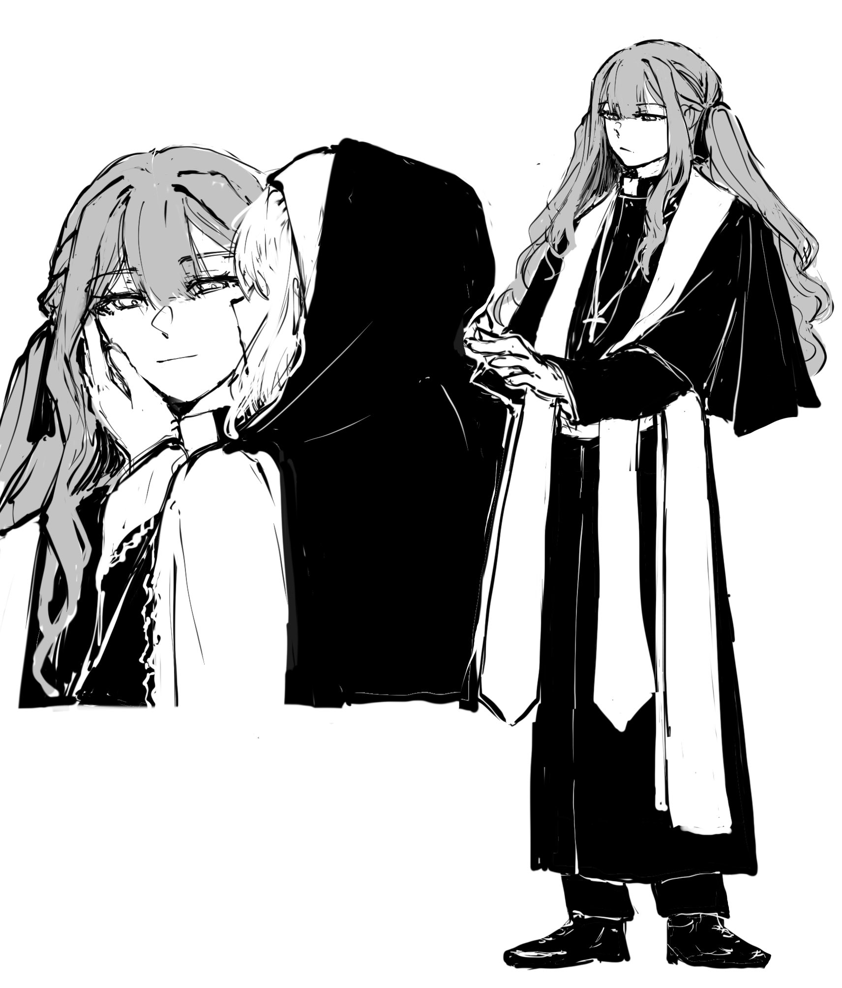 2girlsclosed mouthcrosscross necklaceexpressionlessgreyscalehoodhood upjewelrykisskissing cheeklong hairlong sleevesmonochromemultiple girlsnecklacenunpankoryopriestsmiletwo side upyuri