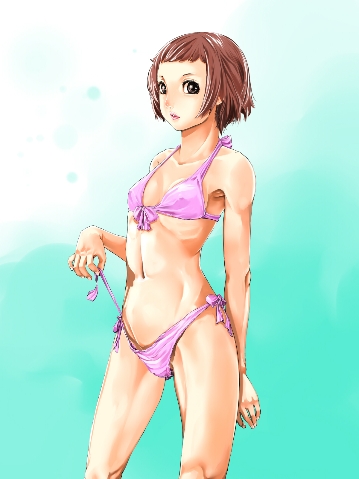 1girlbikinibrown hairfemale focusflat chestgradient backgroundnavelpink bikiniribsshort hairside-tie bikini bottomskinnysoloswimsuit