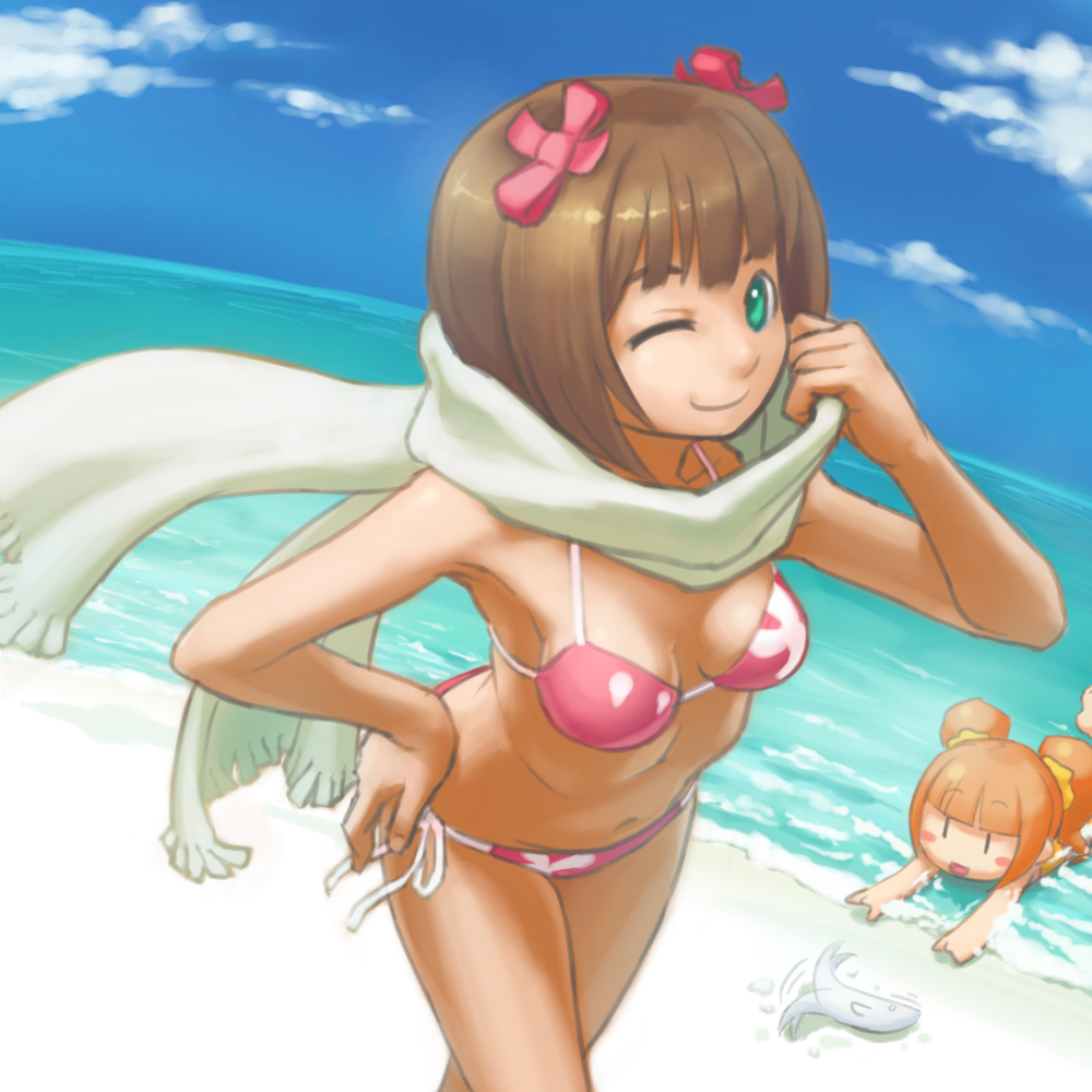 00s1boy2girlsbeachbikinibowbrown hairclouddayfloral printgreen eyeshair bowhand on own hipmultiple girlsoceanone eye closedoutdoorsred bikinired hairscarfside-tie bikini bottomskysmilestring bikiniswimsuitwaterwink