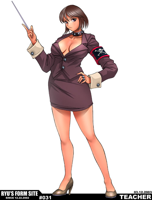 1girlarmbandblue eyesbreastsbrown haircleavagecollarfemale focushigh heelsjewelrylarge breastslegsopen clothespencil skirtringshoesshort hairskirtsoloteacherwand