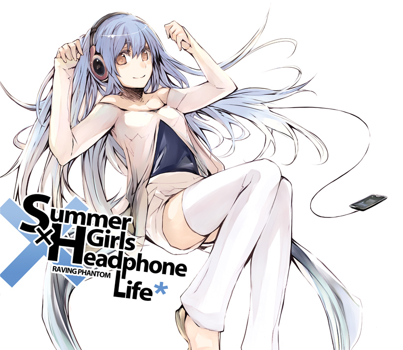1girlbare shouldersblue hairbrown eyesdigital media playerfemale focusheadphoneslong hairlong sleevesshortssleeves past wristssmilesolothighhighs