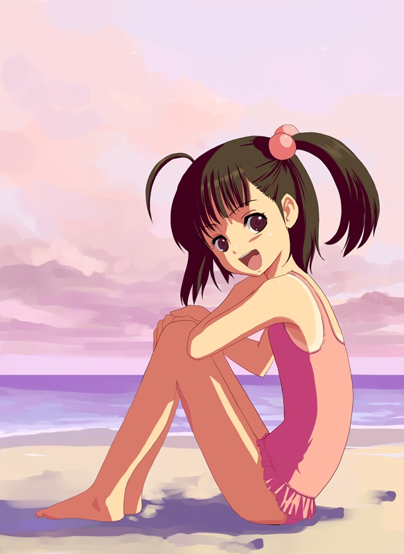 1girlbarefootbeachbrown hairchildfemale focusfrillsfull bodyhair bobbleshair ornamentone-piece swimsuitoutdoorssittingskysoloswimsuittwintails