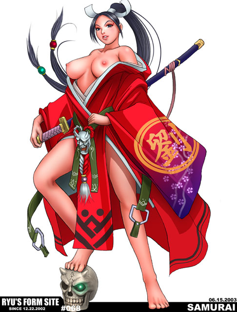 1girlbarefootblack hairbreastsfeetfemale focusfull bodyjapanese clotheskatanakimonolarge breastslegslipslong hairnipplesponytailskullsoloswordweaponwhite background