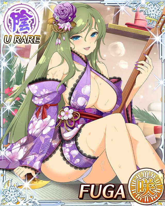 1girlblue eyesborderbreastscard (medium)character namecleavagecleavage cutoutclothing cutoutdetached sleevesenglish textflowergreen hairhair flowerhair ornamentholdingholding instrumentholding plectruminstrumentjapanese clotheskimonolarge breastslong hairlooking at viewermolemole under eyeofficial alternate costumeopen mouthpantiespantyshotplectrumpurple kimonoshamisensittingsmilesolosweatswept bangsunderwearwetwhite panties