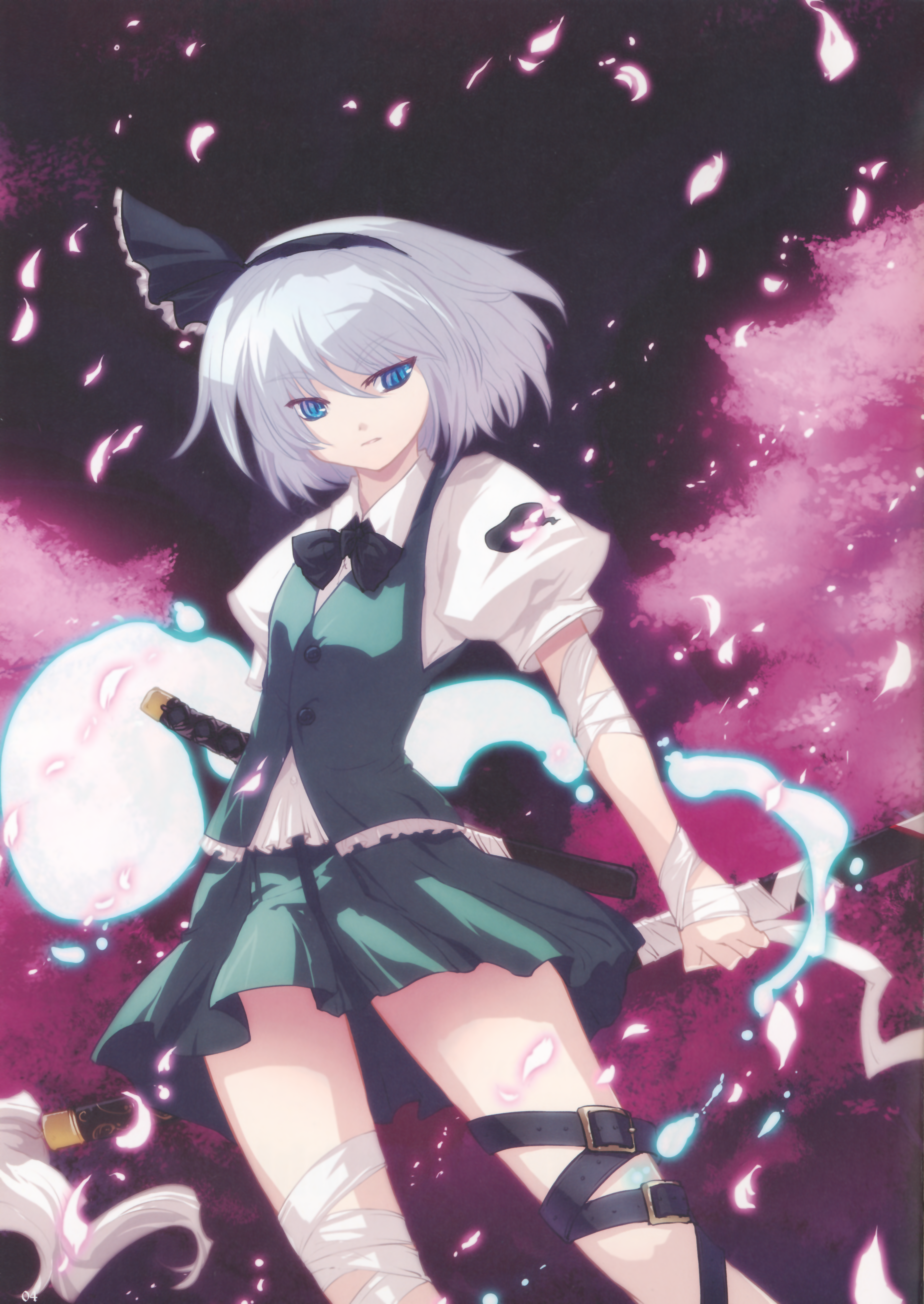 1girlbandagesbeltblue eyescherry blossomsfemale focusghosthairbandhitodamakatanapetalssheathsheathedshort hairsoloswordweapon