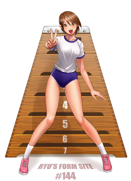 1girlbrown eyesbrown hairburumafemale focusfull bodygym uniformlegsopen mouthshoesshort hairsimple backgroundsneakerssockssolosportswearstandingvvaulting horse