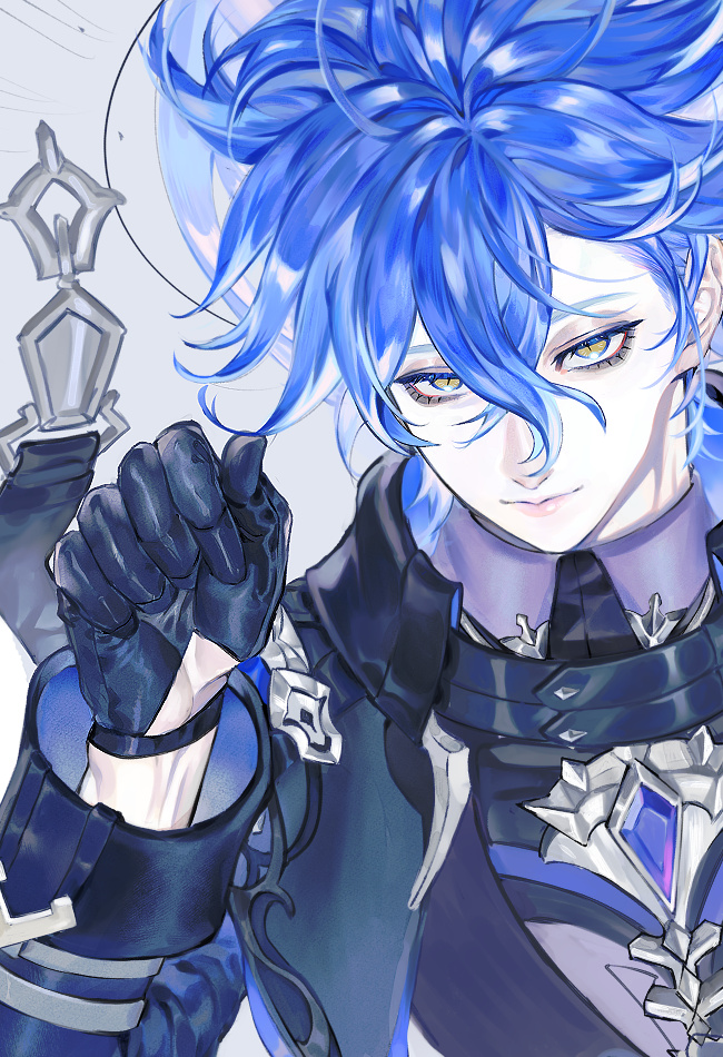 1boyarm upblack glovesblue gemstoneblue hairclosed moutheyelashesgemgloveslipslong sleevesmale focusmeporing worldsleeve cuffssoloupper bodywhite backgroundyellow eyes