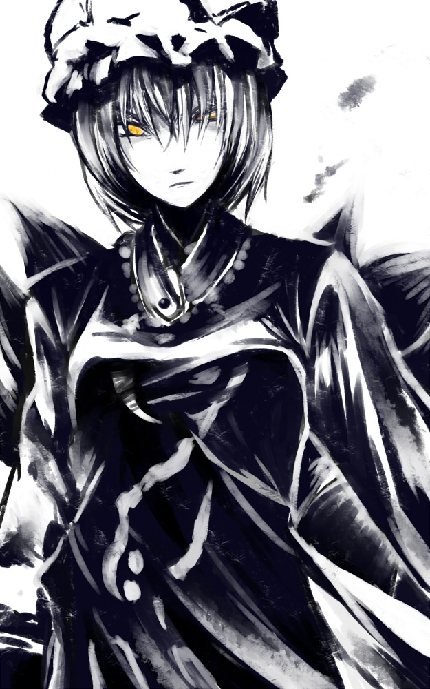 1girlfemale focusfox tailfrownhair over eyeshatlooking at viewermonochromemultiple tailssolospot colortailyellow eyes