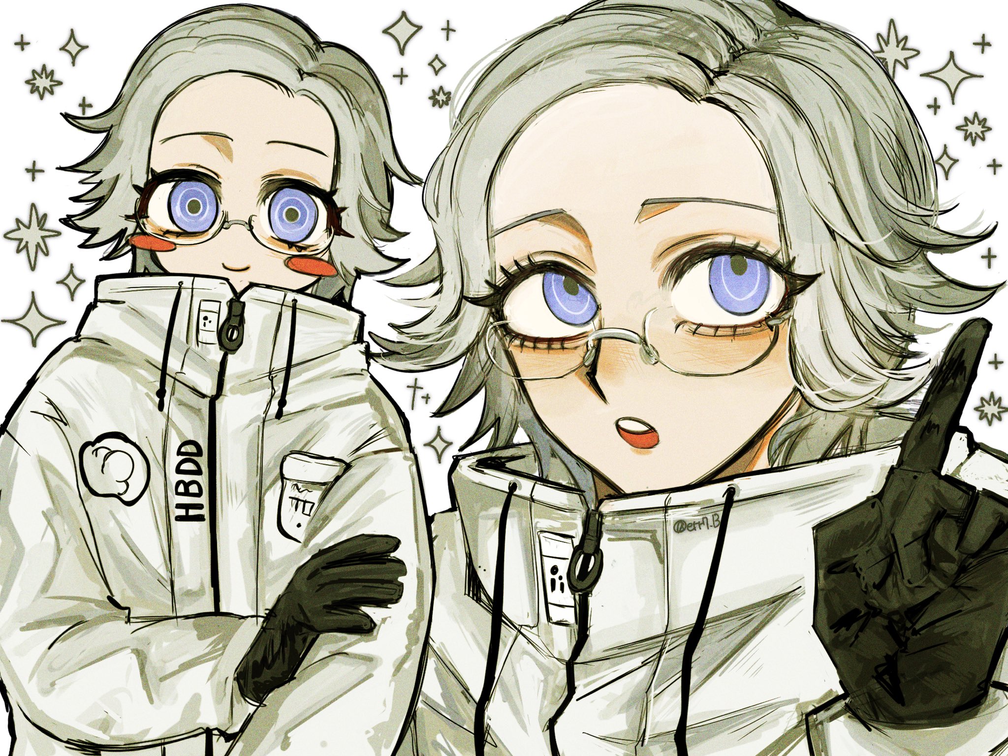 :o1boybababa081black glovesblush stickersbreast pocketdrawstringeyelashesglassesglovesgrey hairhand on own armjacketlooking at viewermale focusmultiple viewspocketpointingpointing uppurple eyesshort hairsmilesparkleteethtwitter usernameupper bodyupper teeth onlyupturned eyeswhite backgroundwhite jacket