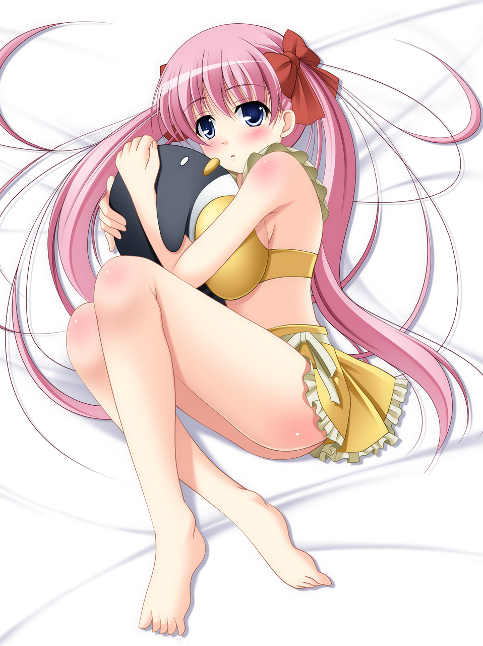 00s1girlbare shouldersbarefootbikinibikini skirtbirdblue eyesblushbowbreastscrop topfeetfemale focusfrillshair bowhuge breastslegslong hairlyingmidriffon sidepenguinpink hairskirtsoloswimsuittwintails