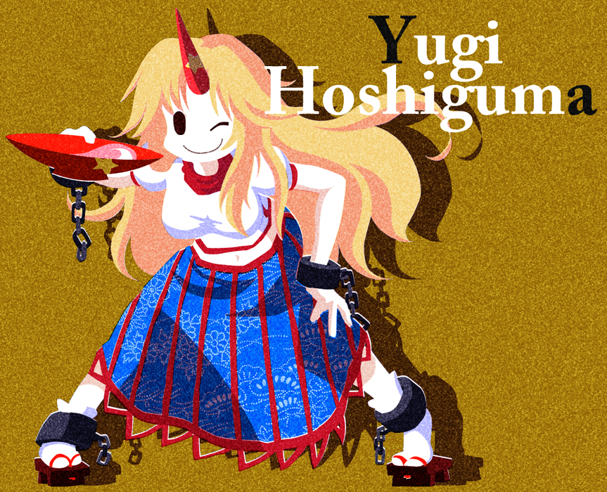 1girlblonde hairchaincharacter namecuffscupfemale focusfull bodygetaholdinghornslong hairmidriffone eye closedsakazukishacklesshort sleevessingle hornsmilesockssolostar (symbol)