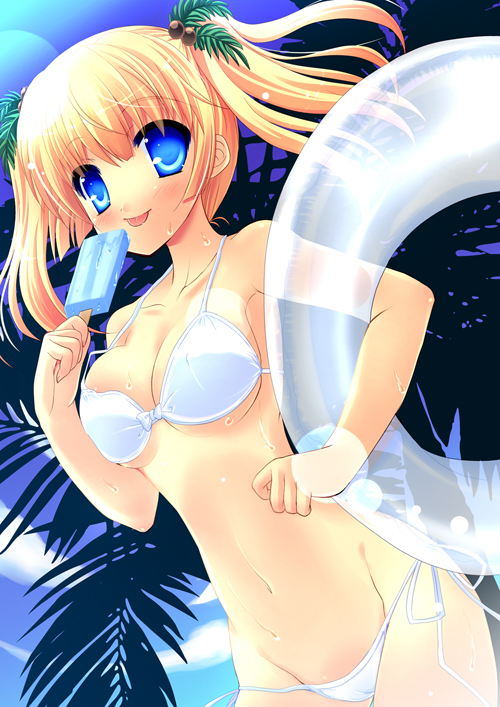 :p1girlbikiniblonde hairblue eyesblushbreastscleavagefemale focusfoodinnertubelarge breastspopsicleside-tie bikini bottomsoloswim ringswimsuittonguetongue outtwintailswetwhite bikini