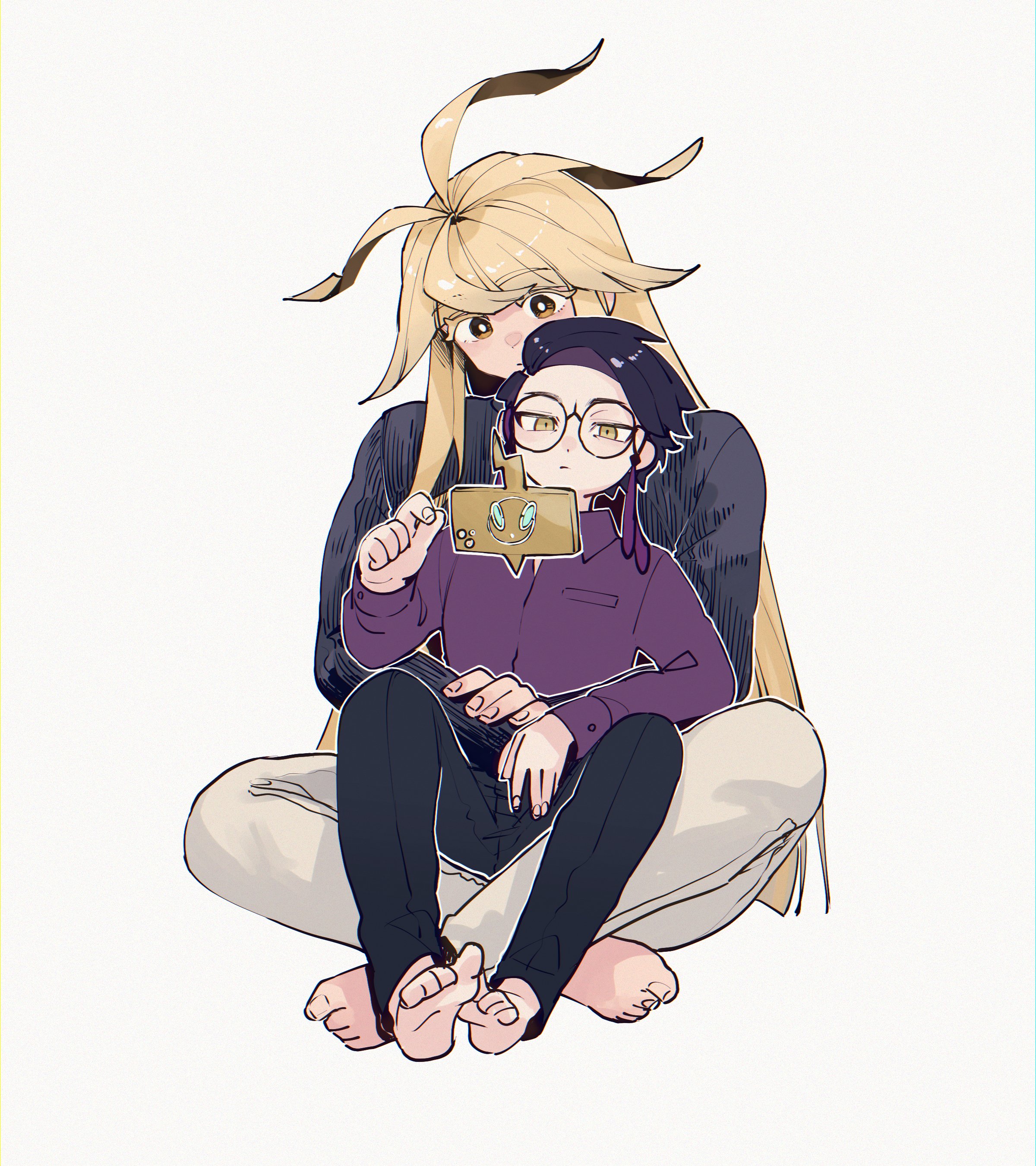 2boysarm upblack pantsblack shirtblack-framed eyewearblonde hairclosed mouthcolored eyelashesdot nosefrowngen 4 pokemonindian stylelong hairlong sleeveslooking at phonemale focusmultiple boyspantsparted hairphonepurple hairpurple shirtq 9 q 1742round eyewearshirtsimple backgroundsittingsitting on lapsitting on personvery long hairwhite backgroundwhite pantsyellow eyes