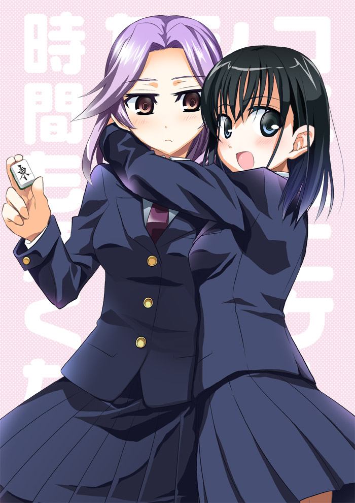 00s2girlsboard gameholdingholding mahjong tilehugmahjongmahjong tilemultiple girlsschool uniform