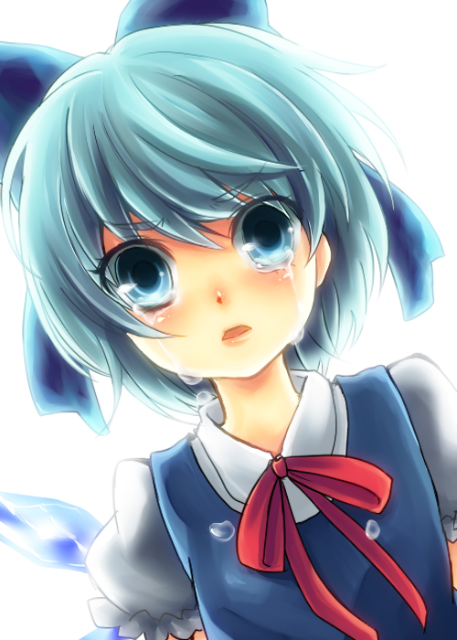 1girlblue eyesblue hairbowcryingcrying with eyes openfemale focushair bowmatching hair/eyesribbonshort hairsolotearswhite backgroundwings