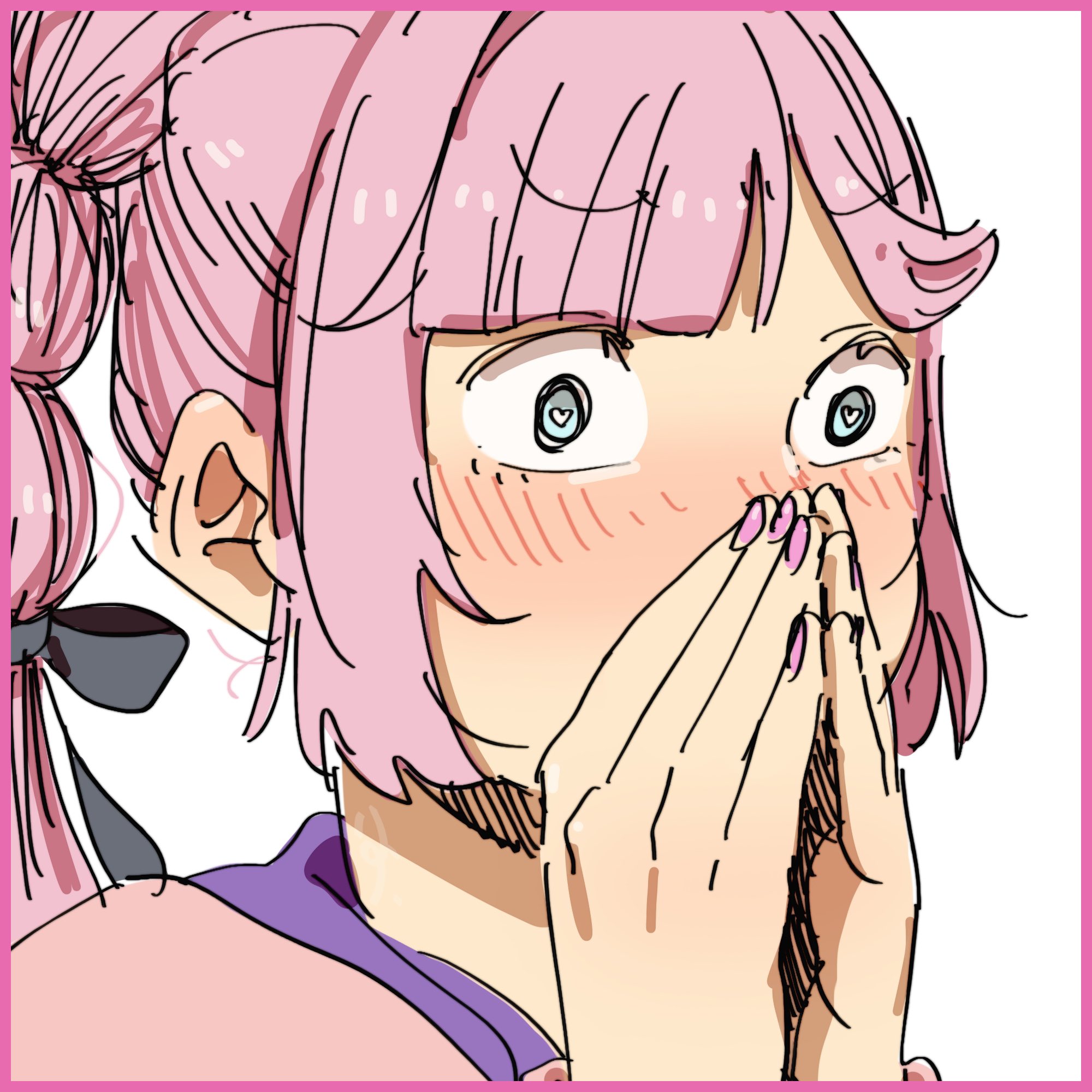1girlblack ribbonblue eyesblushbordercovering own mouthhair ribbonhand over own mouthheartheart-shaped pupilshoodhooded jacketjacketlong sleevesmulti-tied hairnose blushpink borderpink hairpink jacketponytailportraitribbonsidelockssimple backgroundsolosymbol-shaped pupilsvirtual youtuberwhite background